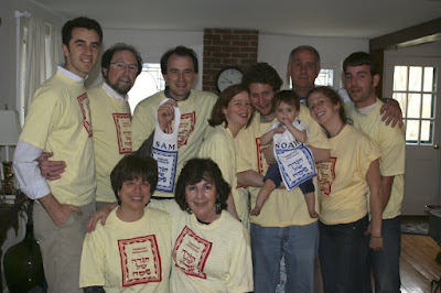 My favorite holiday of the entire year - hopefully it will be Noah's too. We couldn't make a shirt that small, so Dad made Pesach bibs for both Noah and Sam. (Unfortunately, his buddy Sam was sick and couldn't make it - but he will wear it next year). S